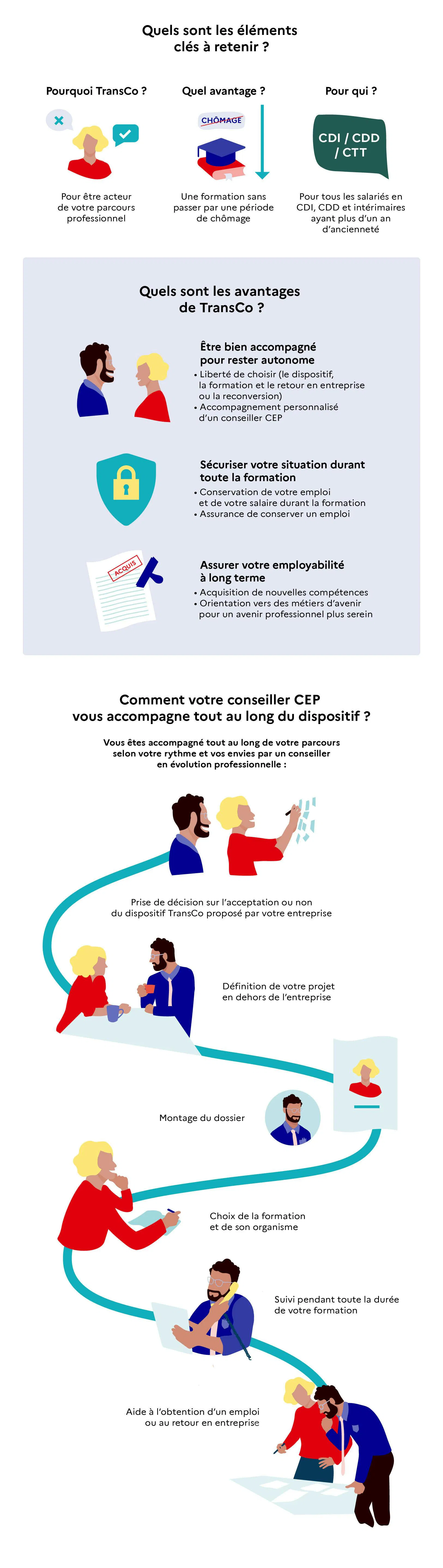 Votre conseiller en évolution professionnelle vous aide à chaque étape de votre parcours de reconversion dans votre région : acceptation du dispositif TransCo, définition de votre projet, montage du dossier, choix de la formation et son organisme, suivi pendant toute la durée de la formation, aide à l’obtention d’un emploi en adéquation avec vos nouvelles compétences ou au retour à votre poste en entreprise.